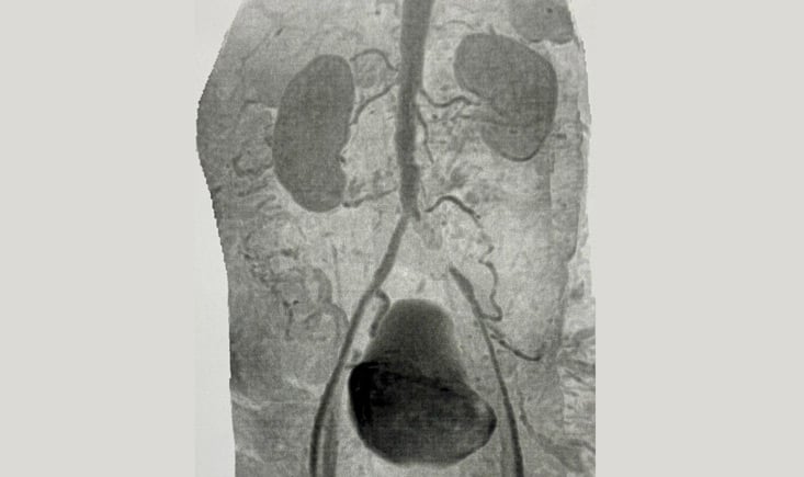 Imaging revealed a total occlusion of the left common iliac artery, with distal refilling through collateral pathways with a patent hypogastric artery.
